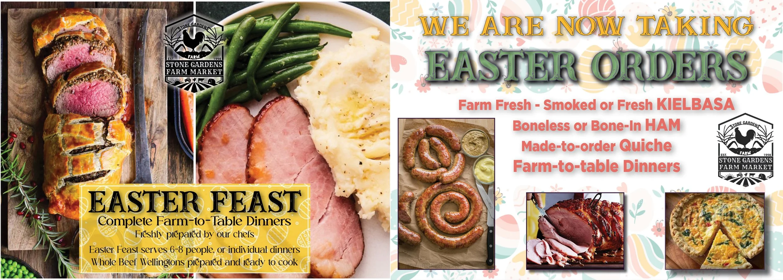 Our chefs will be busy preparing all sorts of delicious dishes for the Easter holiday. This year we’ll have complete Ham Dinners that you can order - family style or individual - depending on how many you’ll be serving. We’ll also have prepared Beef Wellington that you can take home and cook in your own oven. Both are great holiday dinner options. Plus we’ll have all the other Easter dinner options available as well - hams, kielbasa, quiche, roasts, sides, salads, and pie! Everything for a wonderful holiday dinner. See our catering page for more details and ordering information!